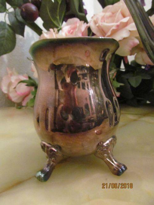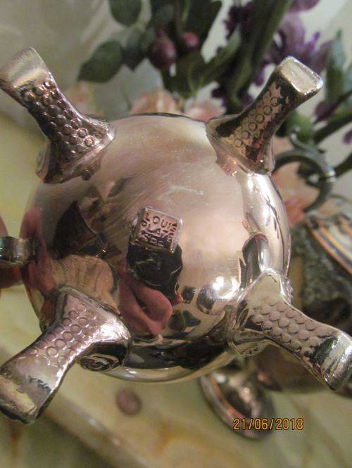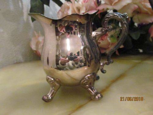 THE CREAMER IS A LOUIS PLATE EDWARDIAN STYLE ITEM WHICH STANDS UPON FOUR CLAW FEET. THE BEST DESCRIPTION FOR THE HANDLE IS AN ORNATELY CRAFTED VICTORIAN STYLE WHILE THE RIM IS SCALLOPED LEADING TO A BROAD SPOUT
