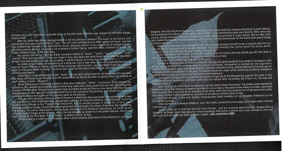 This is Bheke Mseleku's final album, recorded in 2003, and after years of not finding an appreciative audience in apartheid South Africa, he indeed returns home. He died five years later. Home At Last is solid post-bop, contemporary jazz, polished, urbane, and mellow. On this session, Mseleku again is at the piano, but he is joined by a fine ensemble of African jazzmen: Phillip Meintjies or Morabol Morojele at the drums, depending on track; Enoch Mthalane, guitar; Feya Faku, trumpet; saxophonists Winston Mankunku Ngozi and Ezra Ngcukana; percussionist Tiale Makhene, and bassist Herbie Tsoaeli. Within a generous 79 minutes, the 12 tracks provide lyricism, occasional South African melodies, fine improvisational interplay of musicians, and even a clever homage to Thelonious Monk. Mseleku's piano musicianship throughout and the sonority of the horns and tasteful percussion makes pleasurable listening. It is rare for a jazz artist to consistently issue excellent albums; Mseleku's discography is such a collection.