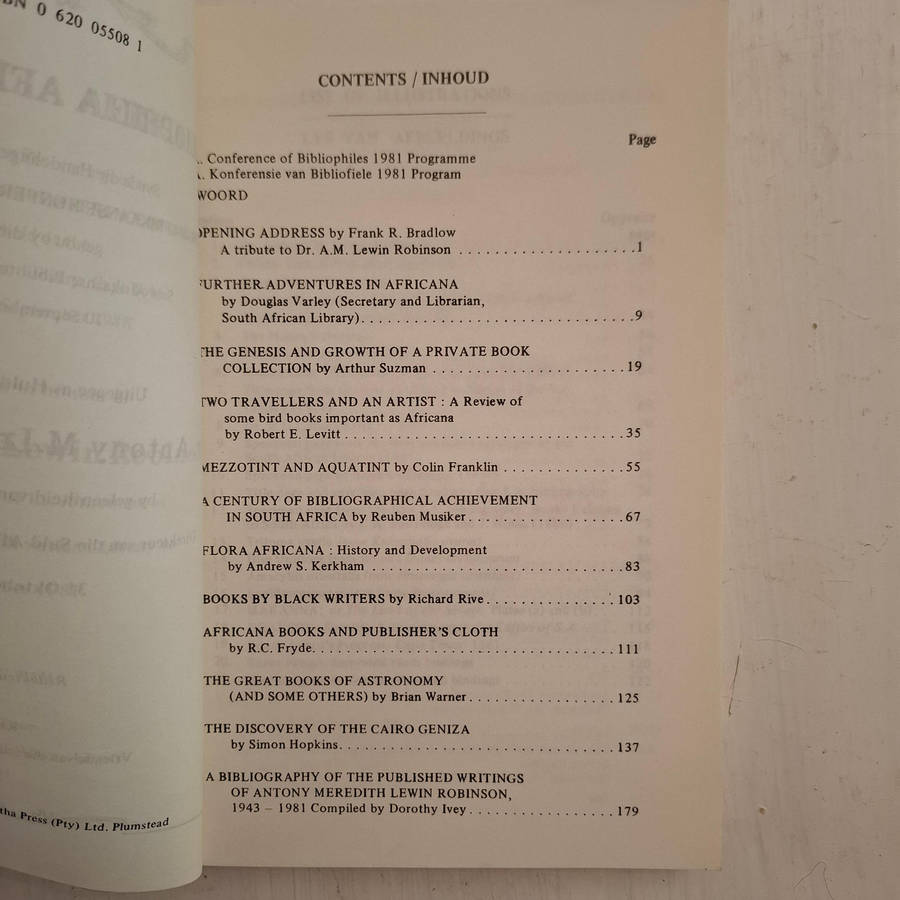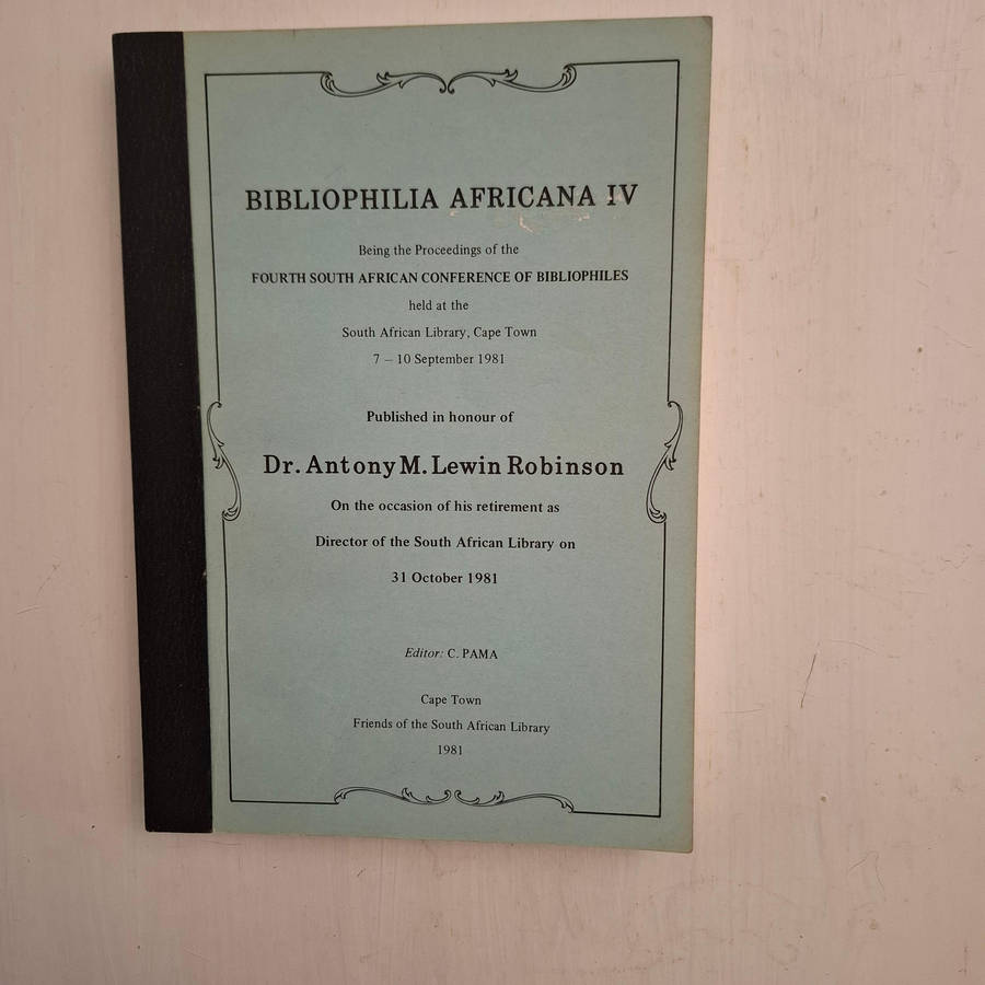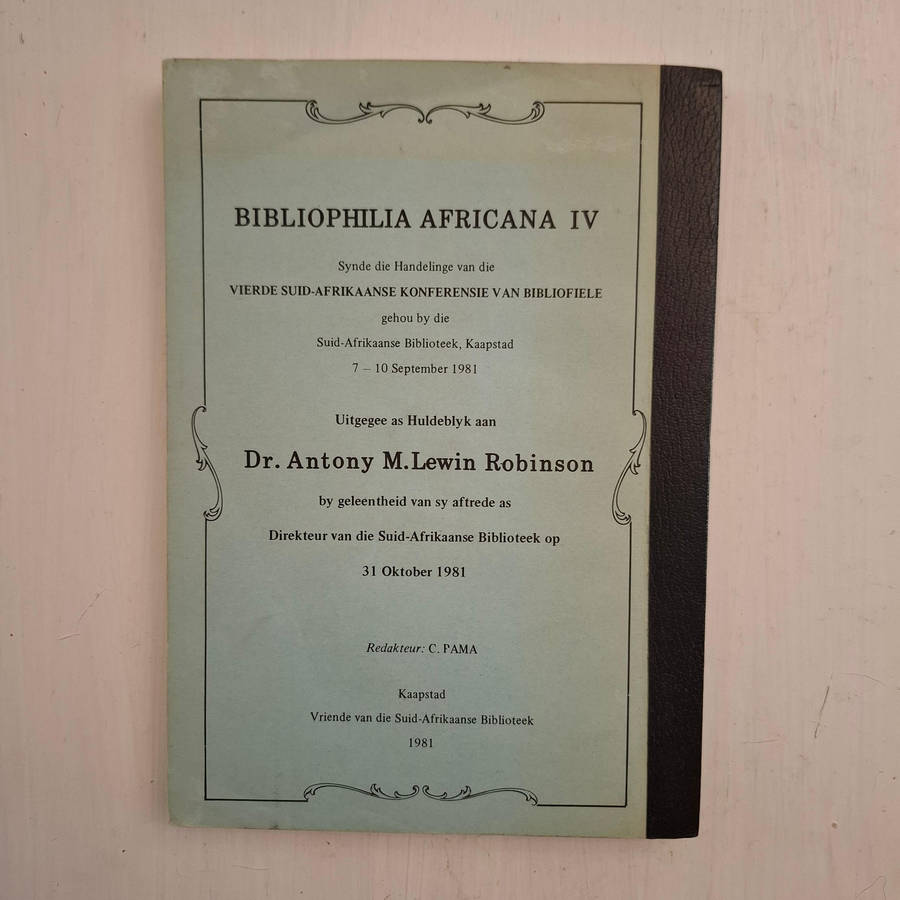 Bibliophilia Africana IV: Being the proceedings of the Fourth South African Conference of Bibliophiles held at the South African Library, Cape Town, 7-10 September 1981 Published in Honour of Dr Antony M Lewin Robinson On the occasion of his retirement as Director of the South African Library on 31 October 1981 / Synde die Handelinge van die Vierde Suid-Afrikaanse Konferensie van Bibliofiele gehou by die Suid-Afrikaanse Biblioteek, Kaapstad, 7-10 September 1981 Uitgegee as huldeblyk aan Dr Antony M Lewin Robinson by geleentheid van sy aftrede as Direkteur van die Suid-Afrikaanse Biblioteek op 31 Oktober 1981