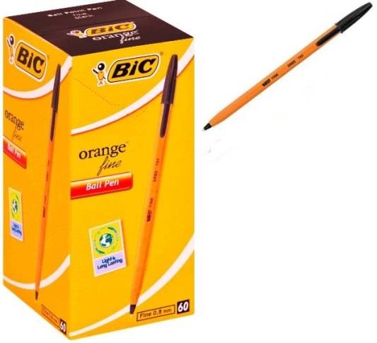 Product Overview The Bic Orange Fine Point lightweight with hexagonal barrel Black Ballpoint Pen ensure a comfortable smooth consistent skip and blob free writing experience .The tungsten carbide ball is a very resistant, perfect sphere and the hexagonal barrel makes for comfortable handling. Ideal for general everyday use, this long-lasting pen has an 0.8mm tip providing a line of 0.3mm, and the barrel end plug and pen cap match the colour of the ink so you'll always be using the correct writing equipment for the job. This item writes in black ink and comes in a pack of 60