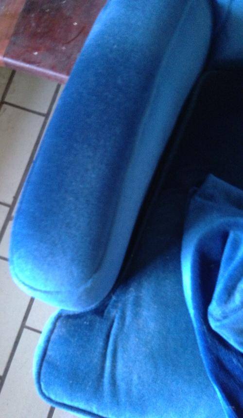 END OF-1 UPHOLSTERED BLUE ARM CHAIR WITH ARM REST COVERS -BACK BUTTONS MISSING MATERIAL RUBBED THIS IS WELL USED CHAIR NEED RE UPHOLSTERING - LISTING