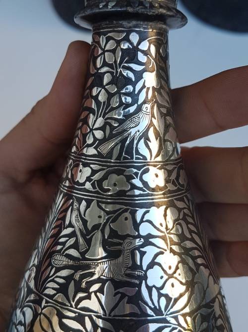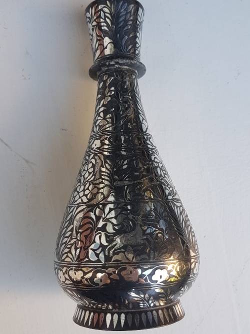 Bidri Indian Metal Vase With Silver overlay, Floral and Animal Motif