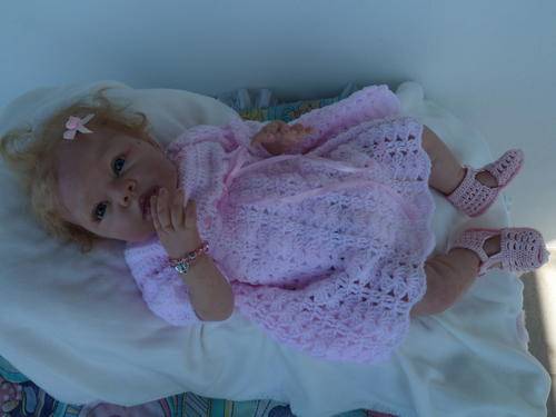 Her limbs are filled with Polypellets and sealed. Her body and head are filled with soft Polyfil with sealed bags of Glass Beads to give her weight, her head is only slightly floppy as she is an older awake baby and not a Newborn.