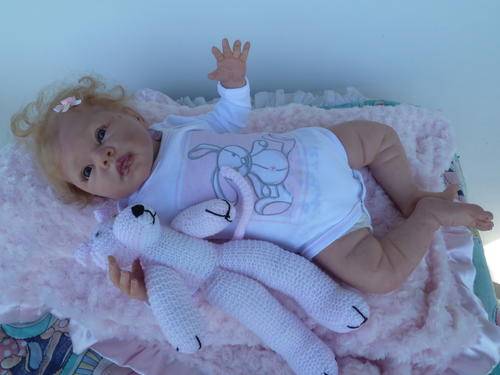 Lila was reborned with many thin layers of Genesis Heat Set Paints, she has mottling and subtle veining. She has 3/4 arms and full legs with a soft doe suede body.