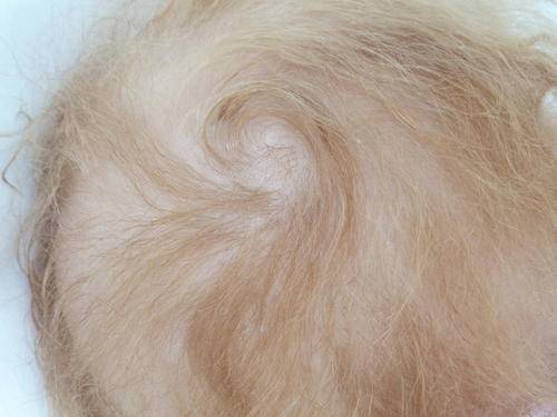 I have micro-rooted her hair with a soft Golden Blonde Mohair and sealed inside so her hair may be styled and her soft curls can be combed into place. She has a Magnet inside her head to hold her Bow in place. Please keep her away from Pacemakers and other Electronic Equipment.