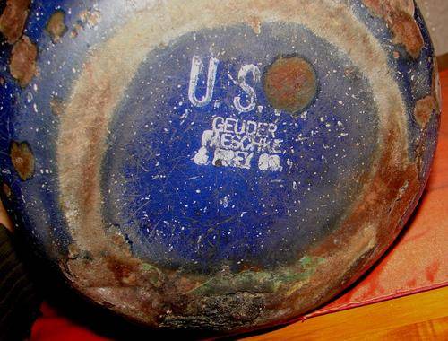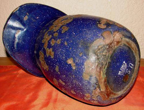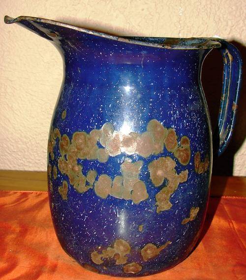 Big Blue and white spotted Enamel Pitcher-Geuder Faschke Frey Co-USA-H 26 cm, Bottom w-18cm