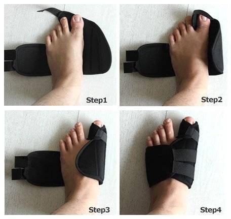 Step 1: Put your feet on the corrector. Step 2:Put on the right side to cover your feet. Step 3:Use the lace up to cover your big toes. Step 4:Fasten the left side to cover your feet entirely.