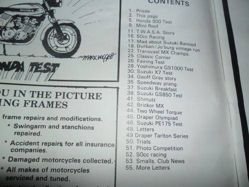 ( HONDA CB900F BOL D'OR , ROB WICKS LESOTHO ENDURANCE RACE , MARK RENEW , FRANCOIS VAN STADEN VOLLY VAN VOLLENHOVEN , SUZUKI X-7 , GERARD LOUW , DAVID EDMOND , JANE WALKER , ROBERT LARNEY , RAND DAILY MAIL CASTOL D.J. RALPH LANGE , FRANK HAYWARD , ROY WHITFIELD , COLLET HEINZE , AMANDA NETTLETON , BILL VON DONGEN , JOHN SIMPSON , COLIN OAKHILL , LEEUKUIL BUNNY SHANDLER , SUZUKI GS1000 YOSHIMURA , JOHN BAKER , GEOFF GRAY , PETER PRINSLOO , MIKE FERREIRA , SUZUKI GS850G , SUZUKI PE 175 , TARLTON LYNTON DRAPER , CHARLIE TISSEN , SWARTKOPS , PAUL SMITH , KEITH ZEEMAN , JOHN EDWARDS )