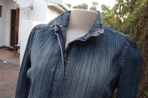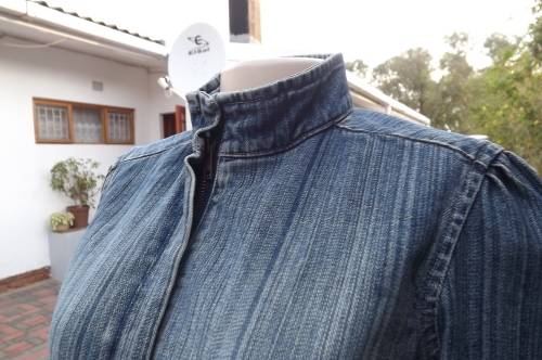 Biker style denim cropped jacket by "Old Navy"in 100% cotton.Size 32/8.Two side pockets and zippered front.High neckline.Press buttons on cuffs and waistband.Good condition.