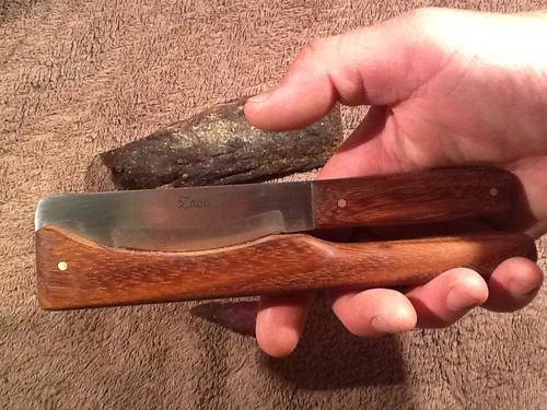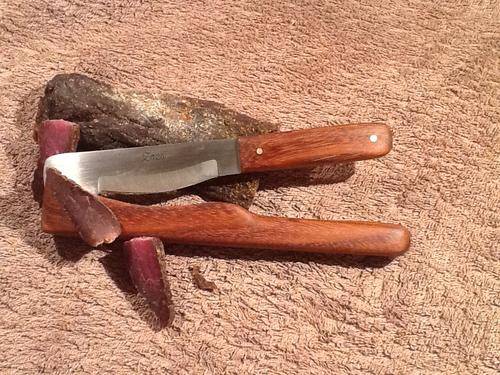 I use various woods for the handles and bases. The wood is mostly darkish. The darkness varies. So the one you receive can differ from picture. This is handmade.
