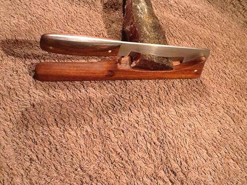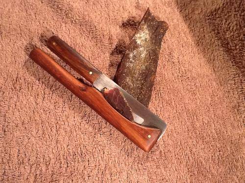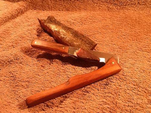 This is a excellent patented design which makes eating a piece of biltong even more enjoyable, without taking the culture of cutting it with a knife away, just altering it a bit. The blade is made from sandvik 12c27 stainless steel. It is tempered to between 55-57 Rockwell hardness, so your blade stay sharp even after cutting a lot of pieces. The Biltong Bandit is 19 cm long, about 4.5 cm high and approx. 2,3cm wide. It is perfect to carry in your pocket. Finally a portable biltong cutter. The cutting edge is 6cm long thus cutting a piece 6cm wide. That is a nice big piece. It cuts biltong so easy that my son of 5 years can cut a piece. Now anyone can cut biltong.