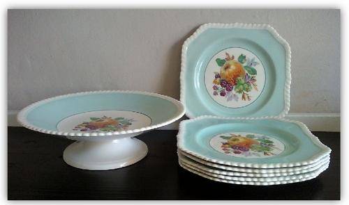 Description:- | Cake Stand + 6 cake plates Markings:- ‘Old English’ Johnson Bros Made in England Beautiful Bright Colors Ideal to serve that Fruit Cake with!! NO cracks or crazing |