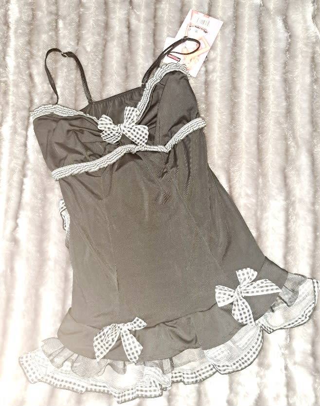 Super cute sexy and flirty stretchy black and white chemise with checkered trim and bow details
