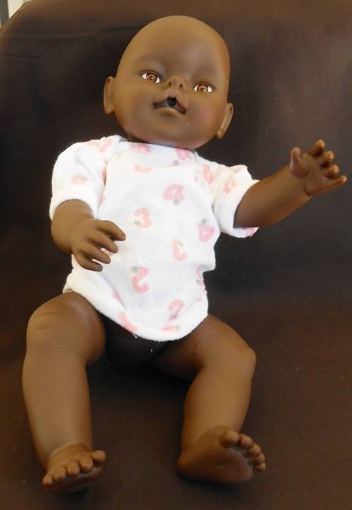 This 43 cm black baby doll looks just like the Baby Born doll by Simba. This is a 'drink and wet doll'
