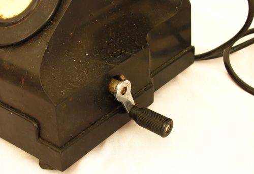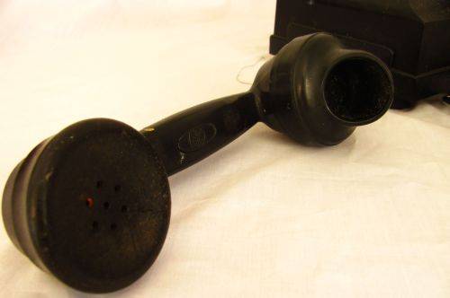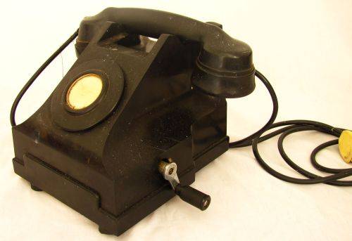 All black vintage telephone is on offer. The crank turns freely and has original plug!