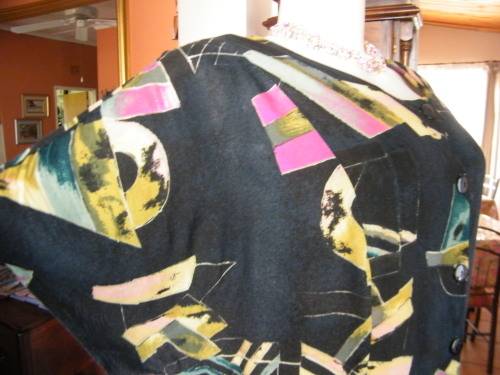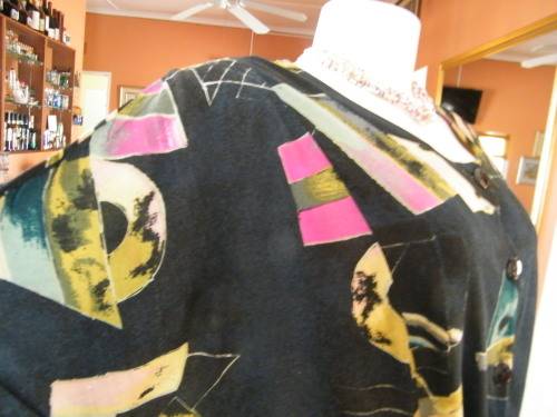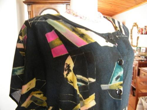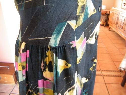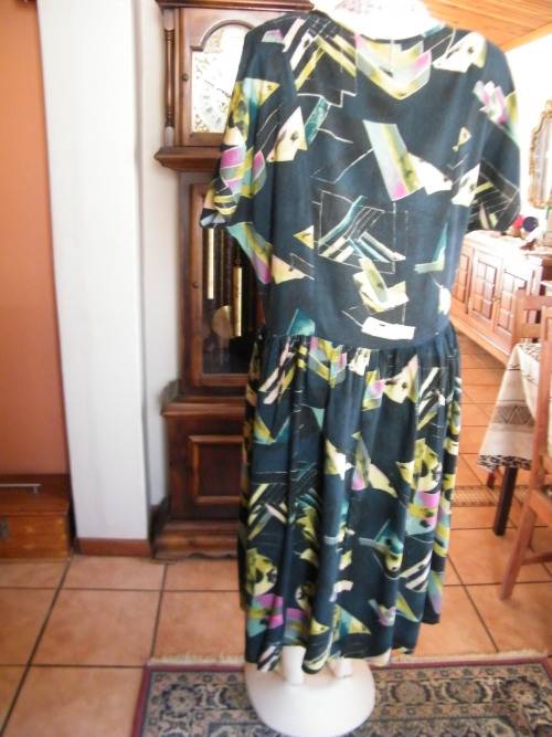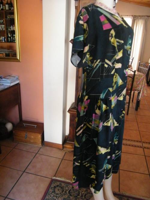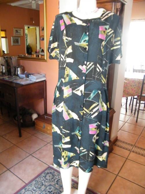 Black FASHIONETTE dress with geometric pink/green designs.Size 42/18.Button down front