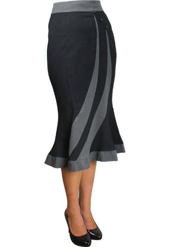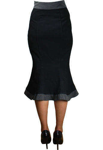 The skirt has the pencil and mermaid elements. It's a retro styled pin-up skirt that is modest and sexy. It has a wide waistband with a hidden zipper in side and button on the front and ruffles on the bottom. It has two swoops of contrasting fabric down the front with three buttons in the top.