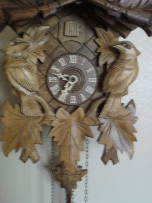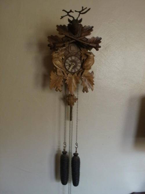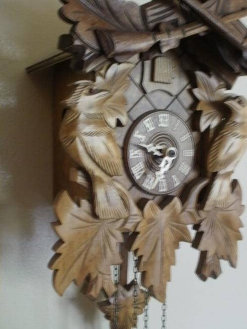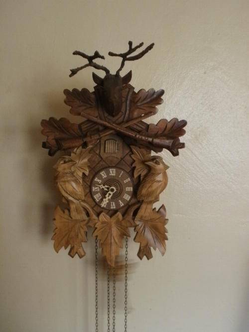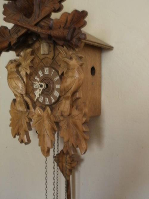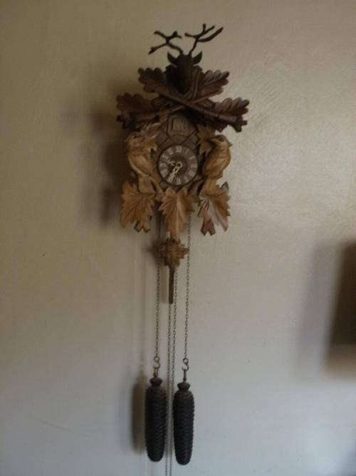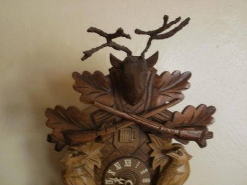 UNUSUAL CUCKOO CLOCK WITH A 8 DAY MOVEMENT. THE CROWN OF THE CLOCK HAS FOR SOME REASON BEEN STAINED