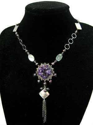 BLACK FRESH WATER PEARL NECKLACE WITH AMETHYST STONES AND MOP NECKLACE