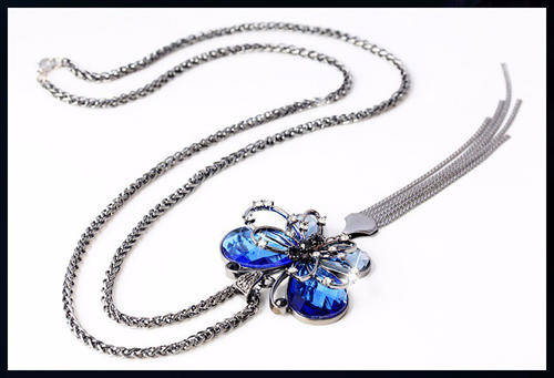 Black Gun Plated Butterfly Simulated Sapphire Crystal and gray CZ crystals Long Tassel Pendant Necklace