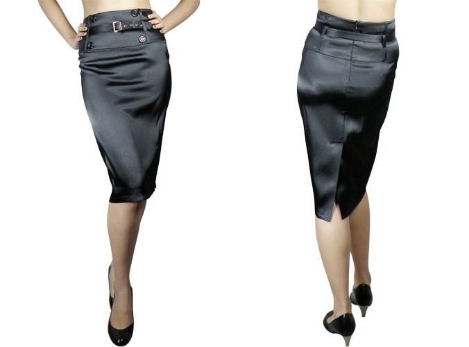 Amazing high waist pencil skirt, with two rows of buttons in front, belted detail waist. A vent back center.