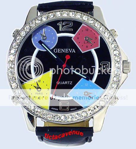 Featuring: Watchcase in circle shaped Clear crystal trimmed on the Bezel Dial in BLACK and Genuine Leather in BLACK color