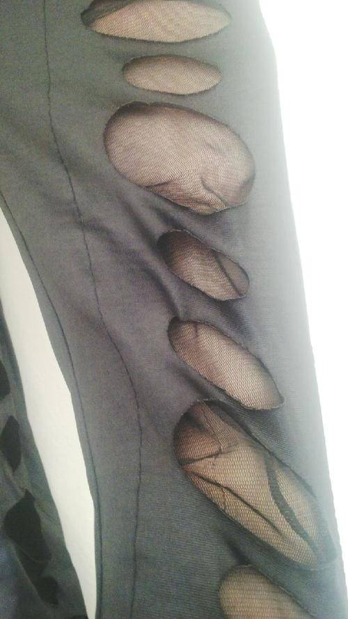 Leather look black leggings with circle cutouts revealing black mesh in excellent condition, brand new.