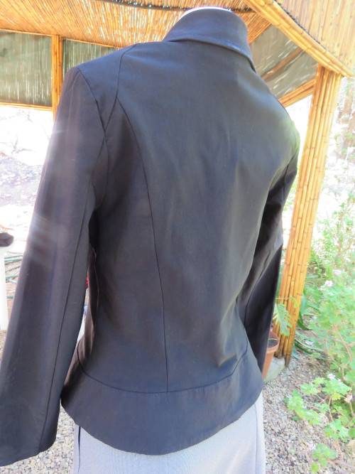 Black long sleeve chic jacket in rayon/nylon stretch Fabric.Size 38/14 by FOSHINI.Tight fit with collar.Close on left front with zip.Nicely styled.Good condition