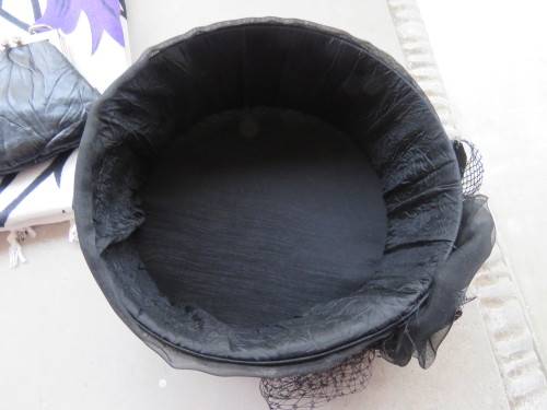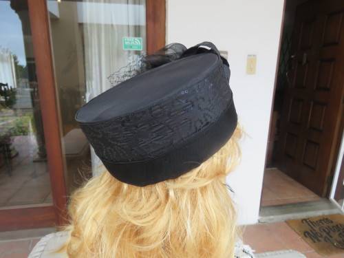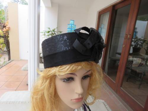 Black pillbox hat decorated with sequins,chiffon and netting.New condition.