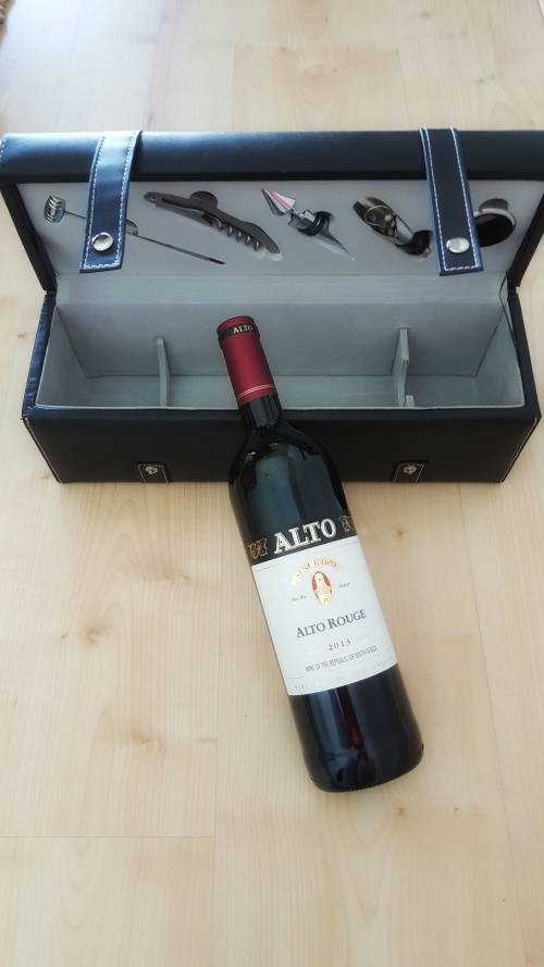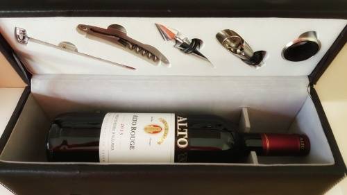 Black PU Leather wine gift box including wine accessories & 750ml bottle of Alto Rouge