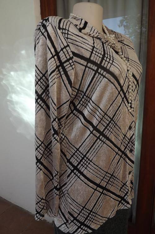 Black see through with beige velour diamond pattern blouse in size 36/12.Button down with collar&lon