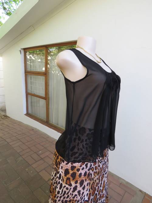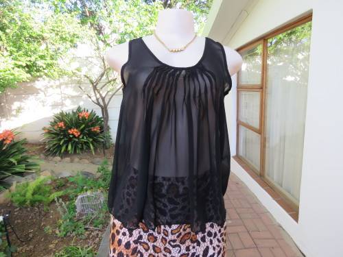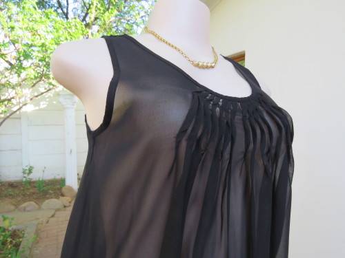 Black sheer polyester loose sleeveless top by STYLE in size 32/8.tucked front neckline.