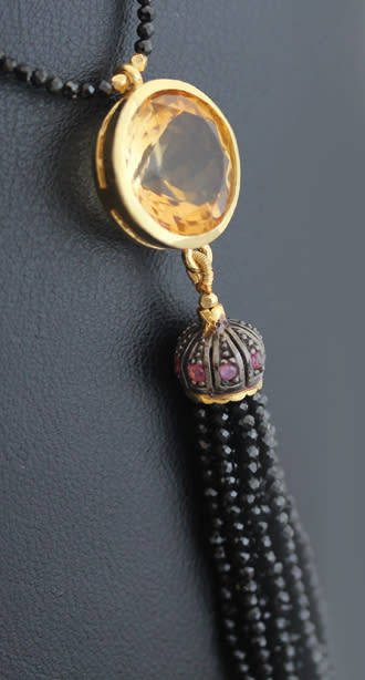 STRIKING LONG BLACK SPINEL NECKLACE WITH LARGE CITRINE PENDANT IN GOLD-HUED STERLING SILVER SET WITH WITH RASPBERRY RHODOLITE GARNETS. 925