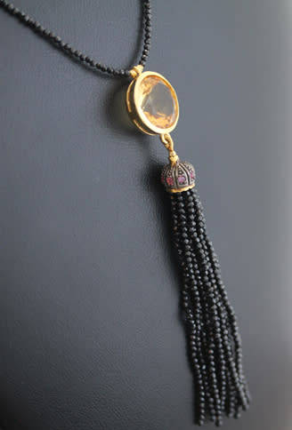 This eye-catching necklace has a 66cm multifaceted black spinel beaded necklace with a 10.5mm long pendant featuring a magnificent large round faceted citrine bezel set in gold-hued sterling silver. The citrine is beautifully faceted and is a whopping 8,5 carats. It is really big and beautiful at 15 mm diameter. From that dangles a domed cap in dark sterling silver which is segmented in a fascinating royal crown-like design, and in the centre of each segment, a round-cut raspberry rhodolite garnet, claw set in the silver. The decorative cap holds a very long black spinel waterfall fringe. It is almost impossible to capture this piece on camera. In real life it is alive with light and sparkle from top to toe. The colours are particularly dramatic with the large yellow citrine contrasting beautifully with the sparkle of the black spinel. The piece weighs 14.66 grams and bears the 925 hallmark indicating sterling silver. Quite a dramatic piece!