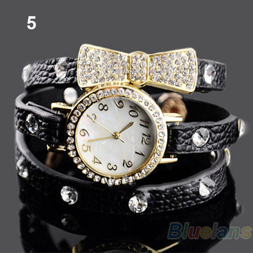BLACK Vogue Women's Crystal Bracelet Bow Leather Strap Chain Quartz Wrist Watch
