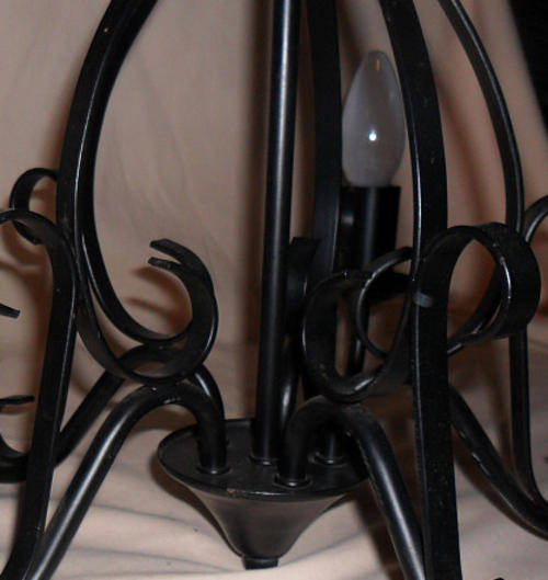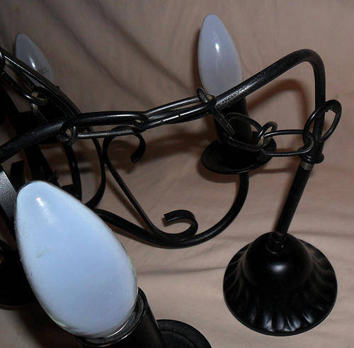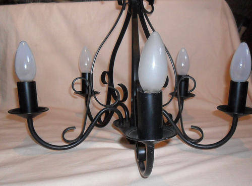 BLACK WROUGHT IRON 5 ARM CHANDELIER -BULBS EXCLUDED - MEASURING 47CM DIAMETER X 36CM HEIGHT EXCLUDING CHAIN -LENGTH OF CHAIN 58CM- PLEASE VIEW PHOTOGRAPHS -POSTAGE R 50