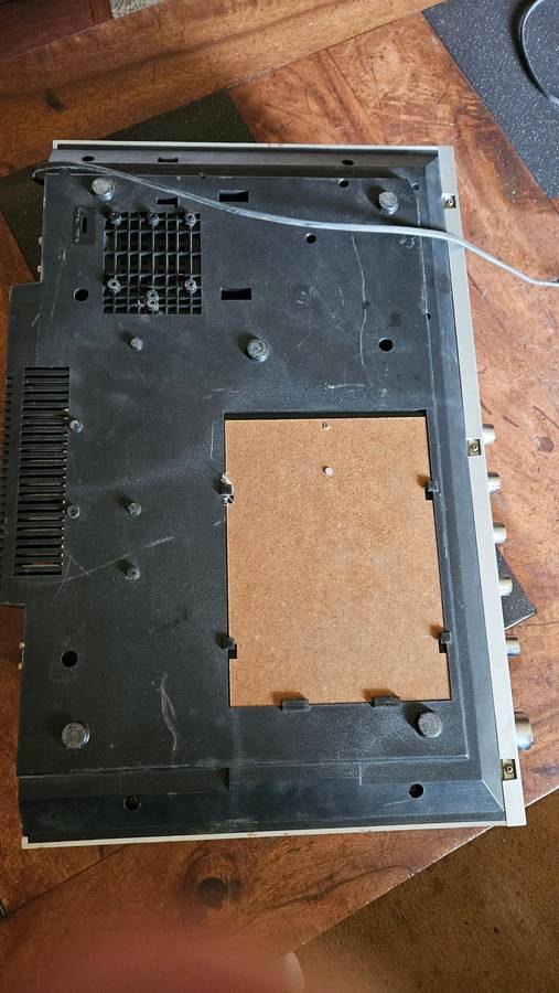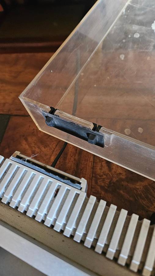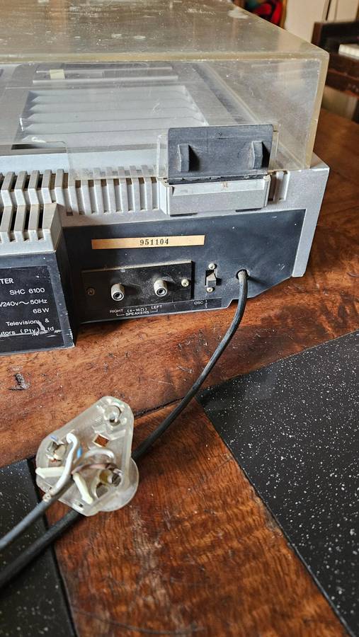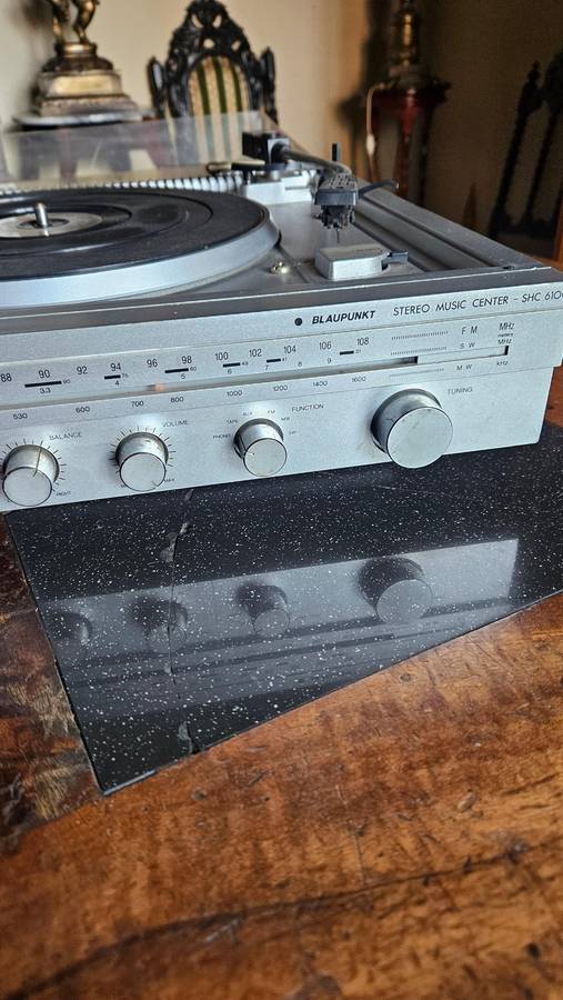 The fast forward, rewind and play works on tape deck just not sure of the recording button. The turntable work and still has the stylus. The whole system powers on but I cant test all the functions because I have no speakers to test the radio or the speaker channels. The plastic cover has marks on it, the left hinge is broken and the right hinge is repaired with a brass hinge.