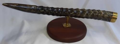 Blesbok Carved Big Five Horm Mounted on Round Wood Base With Brass End Cap