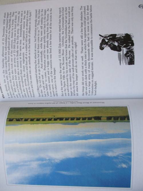 Dingane`s vastly experienced induna (commander) Ndlela planned to follow the Boer horsemen, cross the river and attack them that night but the distance was longer than he had anticipated and the regiments kept getting lost in the mist. Although many of the Zulus had reached the laager during the night, dawn came and saw most of the Zulu army still trying to cross the Ncome river. This mistake on the morning of Sunday December 16th 1838 might be considered to be the critical turning point in the whole of the Great Trek. The Zulu army could have laid siege to the laager, or have waited until the remaining two thirds crossed the Ncome river. Instead, the warriors who had crossed attacked impulsively, being cut down, charge after charge.In the laager was a herd of cattle that, because of the smoke and the din of the guns, threatened to stampede through the laager into the donga. Men were dispatched to that side and out of the laager the few yards to the donga where the Zulus were packed solidly. Every one was shot dead.The Zulus now attacked with even greater ferocity and were crossing the Ncome river in numbers. Moreover, the ammunition was running low so Pretorius chanced sending out men on horseback. Two charges brought little result but a third, of 300 horsemen split the Zulu army and it started to falter.The Boer horsemen were able to pick off the Zulu warriors lining the banks of the river that ran red with their blood and was henceforth called Blood River. A late charge by the Zulu crack corps was to no avail as they became entangled with the retreating warriors. An estimated three thousand Zulu warriors were killed on the veld, in the donga and in the river. Not a single Boer was killed. Despite incredible bravery, the Zulus were no match against a strong defensive position. he parallel with the previous events on the highveld is strong - each encounter starting with a massacre and ending in revenge.
