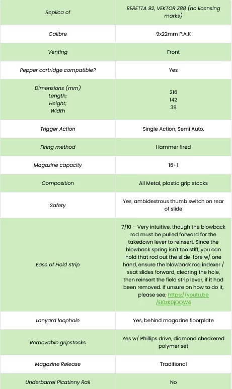 The BLOW F92 is a 1:1 BERETTA 92 / VEKTOR Z88 pistol replica in terms of appearance and functions almost exactly the way its firearm counterpart does;