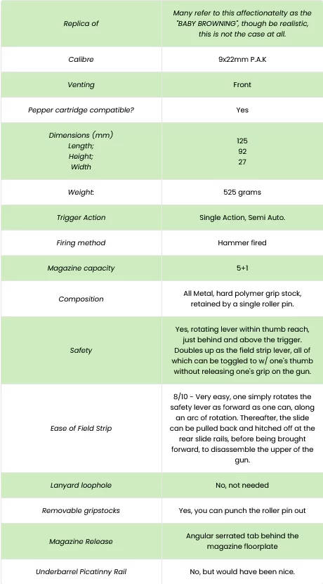 The blowback spring isn't as stiff as the P114's and the pistol cocks very easy. Woman-friendly at that as well. To chamber the first round with a full magazine, one needs to rack the slide all the way to the back and let it go. Don't ride the slide forward, as that might cause a feeding problem - the slide needs to deliberately ram the cartridge into the chamber from behind.