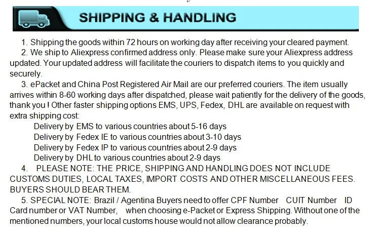 Please note that we are an international store. Delivery takes between 12-25 working days. All products will be shipped to Johannesburg and then delegated to a local courier which will delivery your item to your door. All customs duties will be covered by the store!!!!!