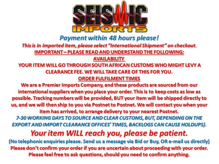 R35.00 Standard shipping using one of our trusted couriers applies to most areas in South Africa. Some areas may attract a R30.00 surcharge. This will be calculated at checkout if applicable. Check my rate