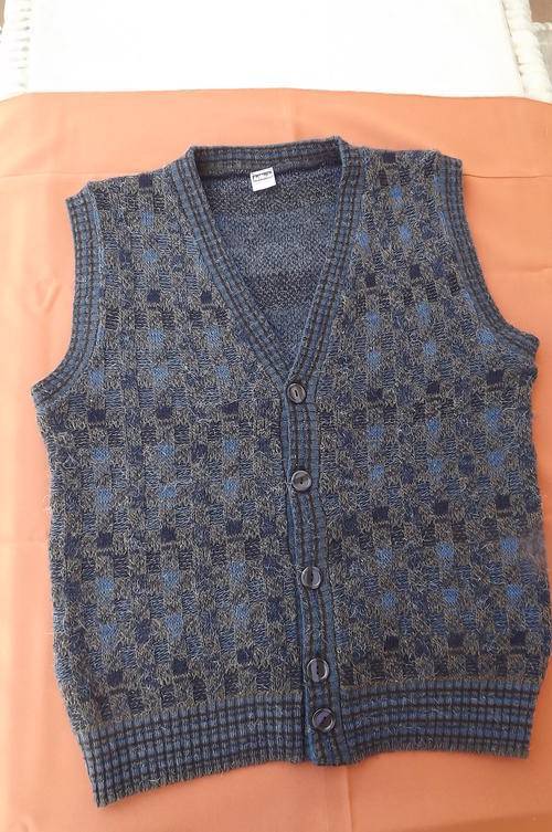 Blue check 100% acrylic knit button down waistcoat by Ascendo.Size Small.Chest 100cm As new.