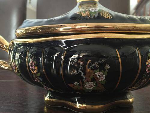 lovely blue and gold bowl with lid and pictures of flowers and peacocks. in as new condition 260 mm wide 100 mm deep and 140 mm to top of finial