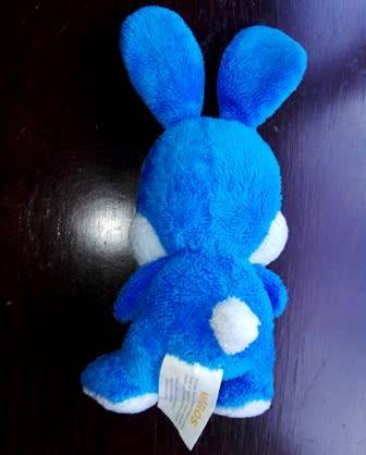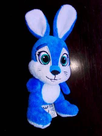 Soft velvety, blue fur with green sewn eyes and black nose and mouth.