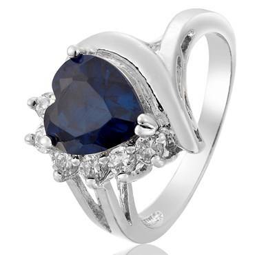 BLUE SAPPHIRE & WHITE CZ HEART RING CRAFTED IN WHITE GOLD PLATING SIZE 8
