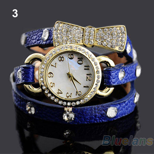 BLUE Vogue Women'S Crystal Bracelet Bow Leather Strap Chain Quartz Wrist Watch