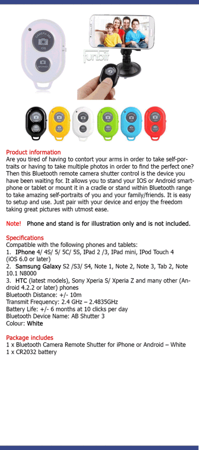 Bluetooth Camera Remote Shutter for iPhone or Android - White