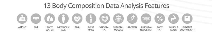 BNETA Smart Body Scale sends 13 vital health metric measurements wirelessly to your FeelFit application on your device. These include your weight, Body Mass Index, Body Water, Metabolic Age, Basal Metabolic Rate, Bone Mass, Visceral Fat, Skeletal Muscle, Protein, Subcutaneous Fat, Body Fat, Muscle Mass and Fat-Free Body Weight.